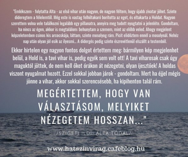 “Emlékszem – folytatta Alta – az első vihar után nagyon, de nagyon féltem, hogy újabb zivatar jöhet. Szinte dideregtem a félelemtől. Még este is vastag felhőtakaró borította az eget, és eltakarta a Holdat. Nagyon szerettem volna vele találkozni legalább egy pillanatra, annyira meg tudott nyugtatni a jelenléte. Gondoltam, ha nincs az égen, akkor is megtalálom: behunytam a szemem, mint az előbb veled. Ahogy megjelent képzeletemben csinos kis arcocskája, láttam, szinte mosolyog rám. Picit elidőztem ennél a mosolynál. Nehéz nap után olyan jól esik az ilyesmi… A didergés pedig szinte észrevétlenül elszállt a testemből.