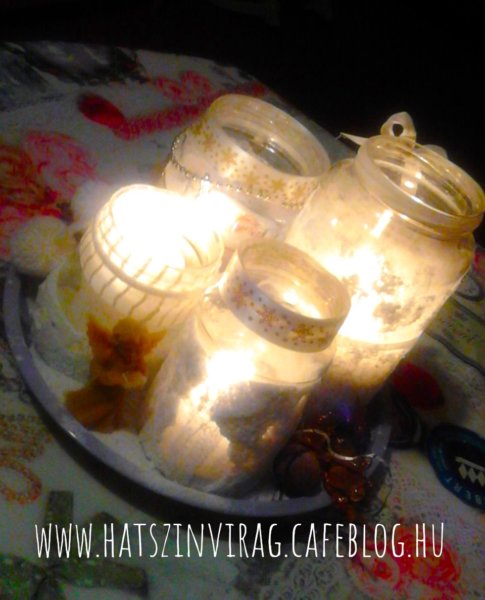 - Gyerekekkel közösen alkotós: Ezt pár éve készítettük az akkor 3 éves nagy fiammal. A Kicsi Lánnyal épp 9. hónapban voltam, szóval valami egyszerűen megvalósítható, aránylag gyors, de szép megoldást kerestem. Ragasztóval bekentük a befőttes üvegeket, beleforgattuk sóba, karácsonyi szalagokkal, díszekkel dekoráltuk, majd az egészet egy karácsonyi tálcára ültettük egy kis angyal figura kíséretében.