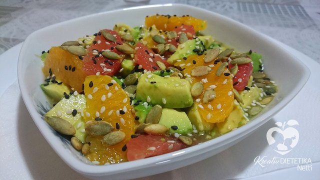 Az öntet hozzávalóit összekeverjük. A narancsokat és a grapfruitot gerezdekre szedjük és felszeleteljük. Aki a grapefruitot nem szereti, készítheti csak narancsból is. Vagy ha szeretitek a pomelot az is mehet bele. Az avokádót felkockázzuk, majd beleforgatjuk gyorsan az öntetbe (mert könnyen elszíneződik). Hozzákeverjük a citrusokat és meghintjük a mag keverékkel.