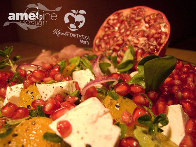 Narancs kifilézve, lilahagyma karikák, feta kockák, vékony sonka szeletek, madársaláta levelek, kakukkfű, bors olívaolaj. Az egészet forgassuk össze, csavarhatunk rá még egy kis narancslét, és máris fogyasztható. Nagyon finom és egészséges!