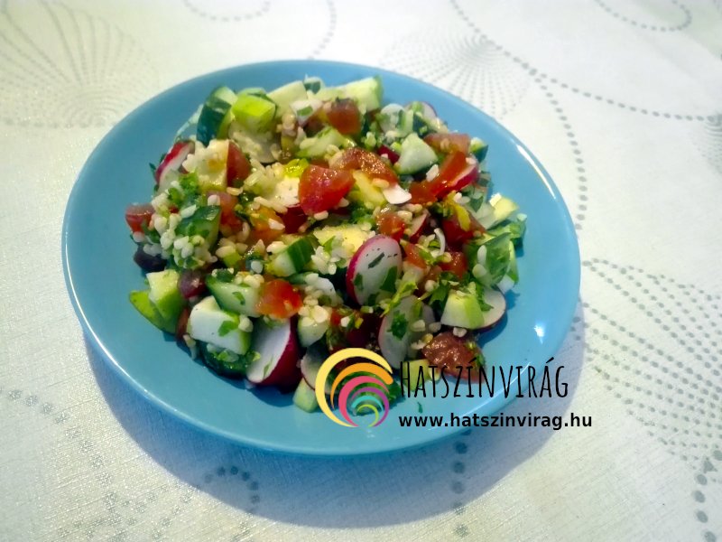 Egy igazán friss ízvilágú, sok-sok zöldfűszerrel készült ízletes saláta, érdemes kipróbálni. Egy kedves barátnőmtől kaptam egy receptcsere kapcsán, Ő pedig egy iraki származású ismerősétől. Szokásomhoz híven kicsit alakítottam rajta, de jelzem majd a leírásnál hol van az eredeti recept és ami már az én fantáziám szüleménye 😉