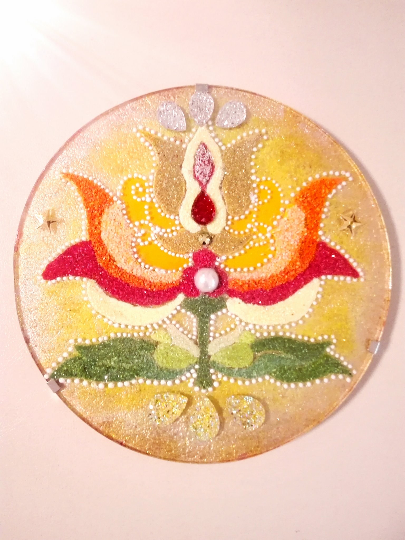 A másik nagy kedvenceim a mandalák: el is készítheted (kőre, üvegre, selyemre, színezheted színezőben…ha nem vagy gyakorlott, rengeteg workshopot találni országszerte) és szintén vásárolhatsz is készen egy szimpatikusat, ha nincs kedved az alkotáshoz. A kis faliképtől elkezdve a hatalmas falmatricákon át sok lehetőség közül lehet válogatni. Én mandalát festeni egy-egy fontosabb életeseményemnél nagyon szeretek, mert remekül fókuszálja az energiákat, segít ellazultan végiggondolni a dolgaimat – ez számomra egy szertartás, egy meditáció, ami segít kijelölni a helyes irányt, majd a kész mandalát kiteszem egy jól látható helyre, ahol a szürke és nehéz pillanatokban emlékeztet a célomra, erőt ad és megtart az úton. Ezt például akkor készítettem, amikor elkezdtem tervezgetni a vállalkozásomat, ebbe a képbe belesűrítettem minden érzést és gondolatot, amit a Hatszínvirággal szeretnék átadni: