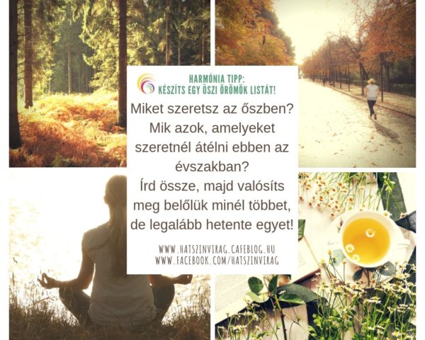 A hétvégére még mindig szép, napsütéses őszi időt jósolnak. Használd ki! 🙂 Arra biztatlak, hogy szánj rá 5-10 percet, és készíts egy őszi örömök listát, ahol leírod, hogy mik azok a dolgok, amik számodra örömet okoznak az őszi időszakban, és valósíts meg belőlük minél többet. Vedd számba, hogy: