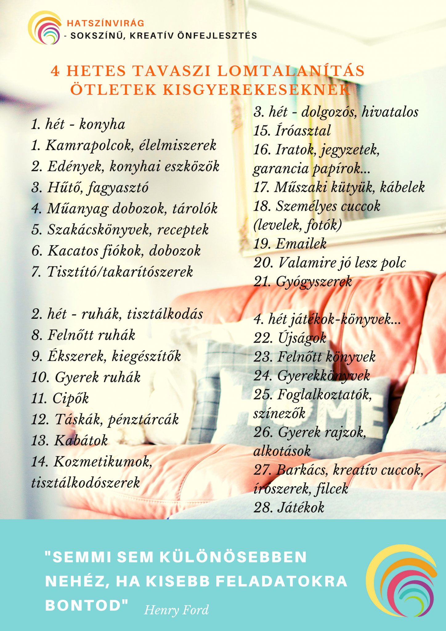 Jó ötlet lehet a lista megírásánál, ha kisebb részekre osztod a feladatot, és 1-1 hétre, amit erre szánsz felosztod pár főbb pontra (pl. témák, funkciók vagy helyiségek szerint) a házat/lakást. Nálam pl így néz ki a 4 hét: