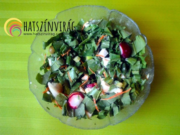 Az elején a sóska mennyiségével óvatos voltam, mert nem voltam biztos a sikerben, ezért készítettem így, hogy a “zöld leveles rész” fele sóska-fele saláta volt. Mivel bevált, kipróbáltam utána úgy is, hogy saláta helyett is sóskát raktam bele, úgy is sikeres volt a történet 🙂 Ez már a csupa sóskás verzió: