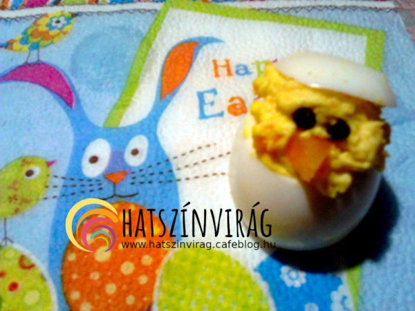 A főtt tojásoknak az aljából leszelünk egy vékony karikát, hogy meg tudjon állni a talpán a kiscsibénk. Ezután levágjuk a tetejéről egy karikát, ezt félretesszük – ez kerül majd vissza rá a tetejére. A sárgájukat kiskanállal kiszedjük, egy tálba merjük. Sajtkrémmel, borssal ízesítjük. Külön sózni nem szükséges, a sajtkrém önmagában is elég sós általában. Kiskanállal vagy habzsákkal visszatöltjük a félbe vágott fehérjékbe. A borsból szemet, a répacsíkból csőrt vágunk nekik. Aki szeretné, répacsíkból lábakat is készíthet a kis pipiknek (lásd video), én ezt a mozzanatot már ki szoktam hagyni. Mellé sonkaszeleteket és tavaszi sóskasalátát tálaltunk (utóbbi receptjét lásd lent).